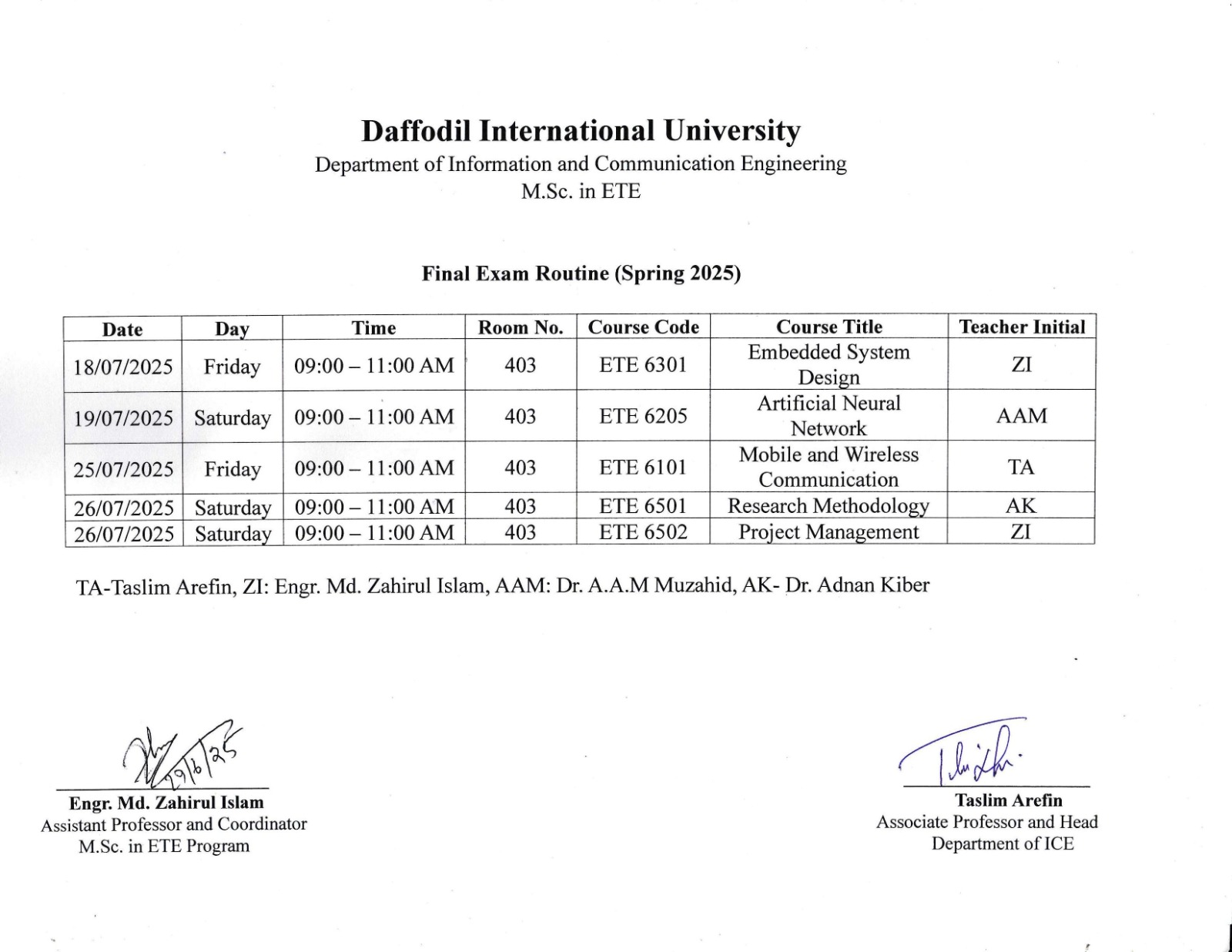 M.Sc. in ETE, FINAL EXAM ROUTINE, SPRING 2025